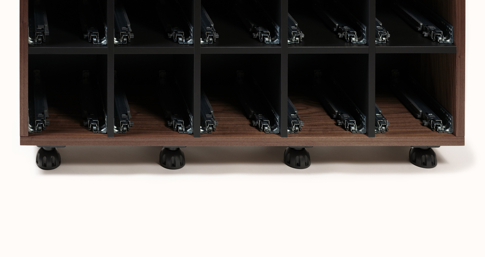 Die Fachböden, Trennwände und die Rückwand sind melaminharzbeschichtete Dekorspanplatten mit farblich passender Rundumbekantung. In unserem Anfrage-Checkout bieten wir eine Auswahl an Farben an. Die Sockelblende ist immer mit antistatischem Möbellinoleum in der Farbe Charcoal bezogen.